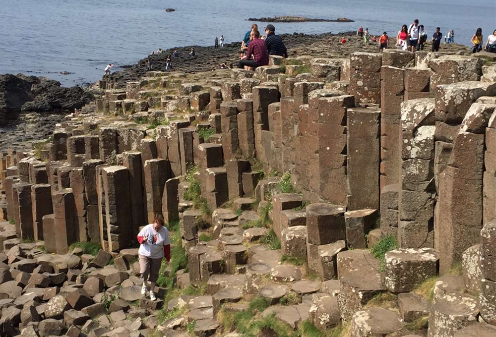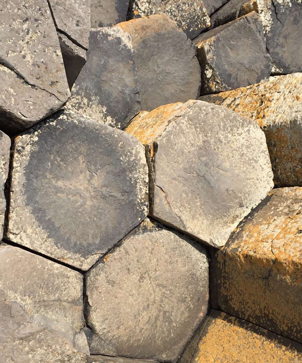 約五千萬年前,在今天蘇格蘭西部?jī)?nèi)赫布里底群島一線至北愛爾蘭東部火山非?;钴S,一股股玄武巖巖熔流從裂隙的地殼中涌出,隨著灼熱的熔巖冷卻收縮,結(jié)晶的時(shí)候,開始爆裂呈規(guī)則的六邊形形態(tài)。李仁奇 攝