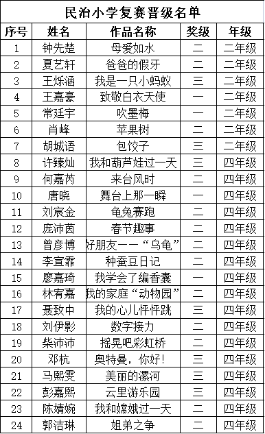 自2021年1月,活動(dòng)征稿啟動(dòng)以來,獲得了深圳市廣大中小學(xué)生、教師、文學(xué)愛好者的熱烈響應(yīng)積極參與,吸引了深圳百余所學(xué)校的上萬人關(guān)注報(bào)名。現(xiàn)公布龍華區(qū)民治小學(xué)晉級(jí)復(fù)賽名單如下: