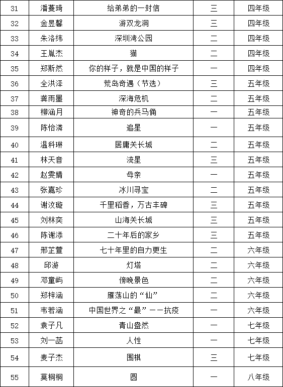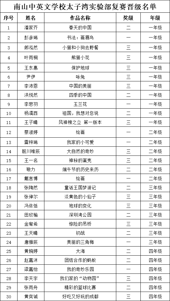 自2021年1月,活動征稿啟動以來,獲得了深圳市廣大中小學(xué)生、教師、文學(xué)愛好者的熱烈響應(yīng)積極參與,吸引了深圳百余所學(xué)校的上萬人關(guān)注報名。現(xiàn)公布南山中英文學(xué)校太子灣實驗部晉級復(fù)賽名單如下: