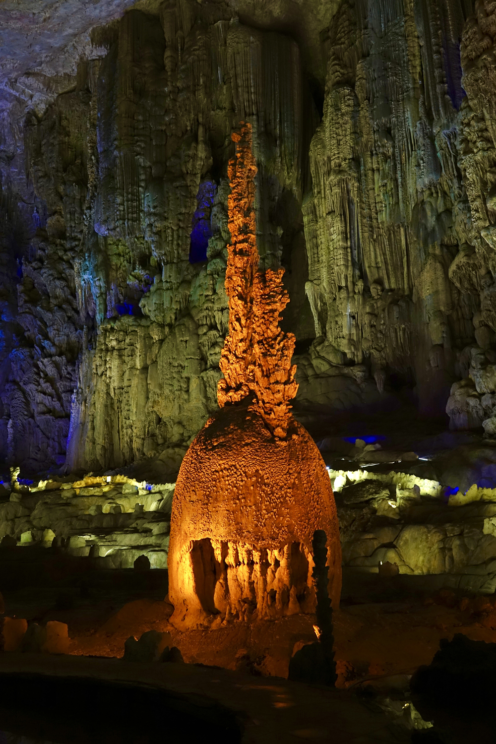 “霸王盔”,在一直徑3米多的圓形堆積物上又長(zhǎng)出兩支并靠的戟形石筍,很像西楚霸王項(xiàng)羽所佩戴的頭盔。李仁奇 攝