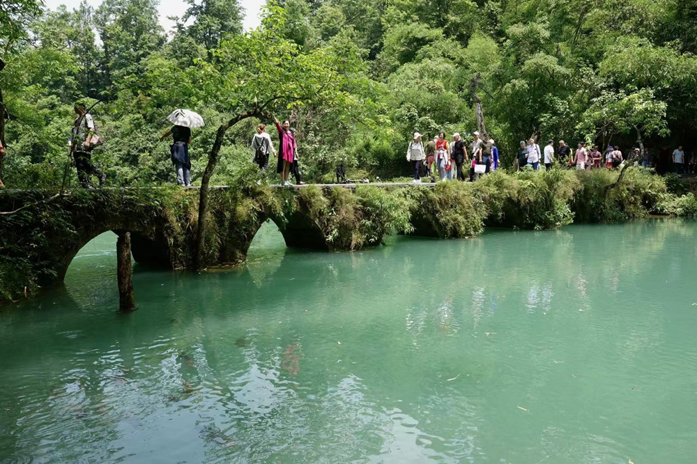 小七孔得名于響水河上一座青石砌成的七孔拱橋,為道光十五年所建。這座古橋與獨(dú)特的68級瀑布使得景區(qū)聲名遠(yuǎn)播,每年吸引近百萬中外游客前來旅游。李仁奇 攝