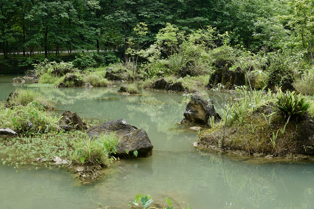 水中的石頭長滿蕨類植物,就像一個個盆栽。李仁奇 攝