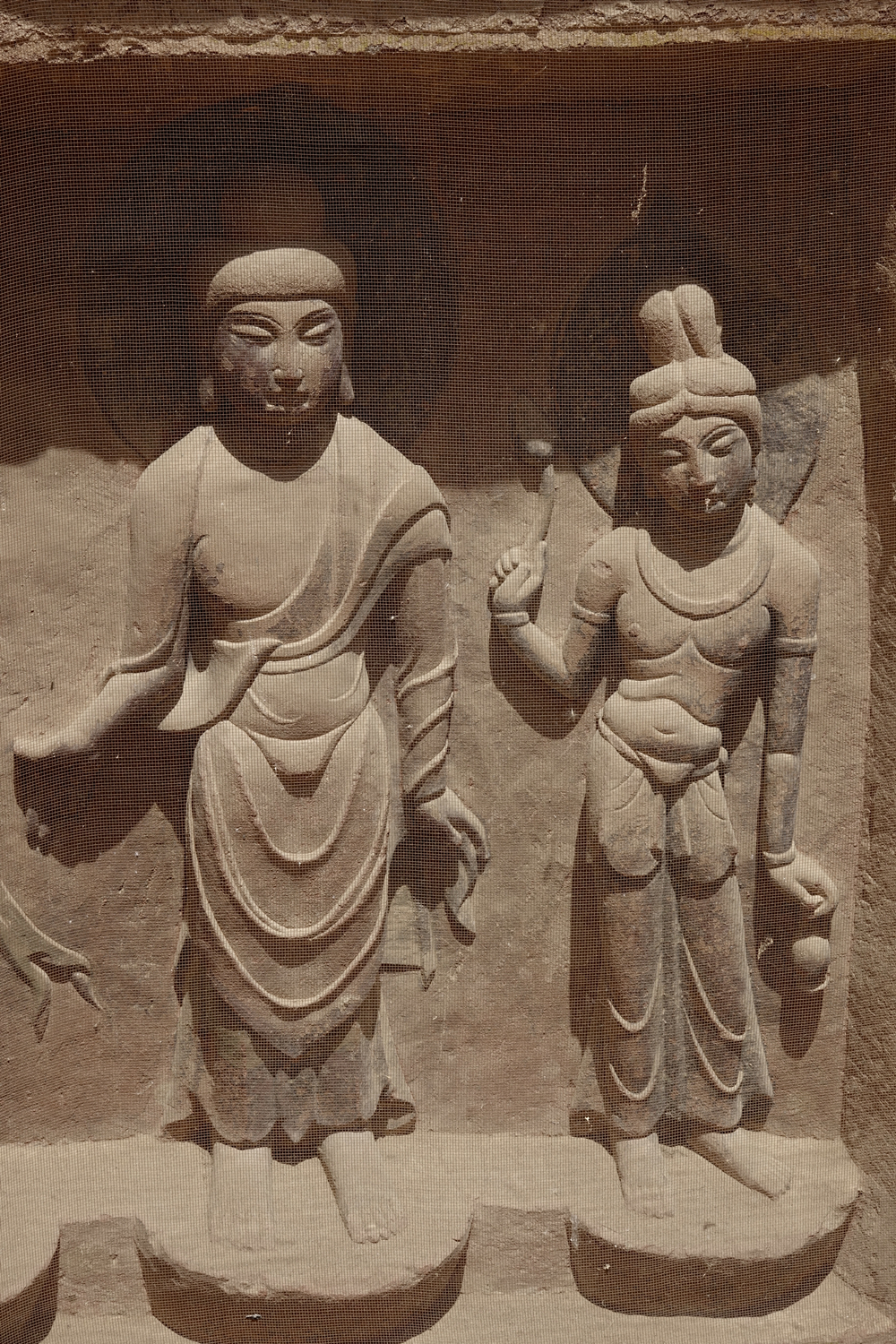 82窟,一結(jié)跏趺坐佛二脅侍菩薩,佛左右壁畫二弟子??唔敽烷T道露出底層,為北周原作,表層壁畫為明代重繪。李仁奇 攝