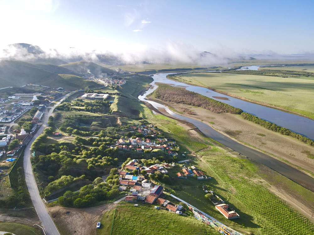 往白河方向遠(yuǎn)眺,群山煙霧繚繞,如夢似幻;山下索克藏寺,沐浴晨光。航拍圖,郭國政 攝