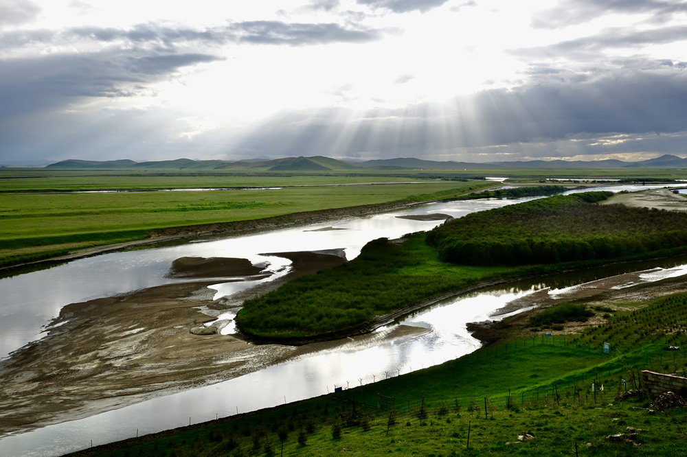 在陽(yáng)光的照耀下,水面上閃耀著粼粼波光,遠(yuǎn)處群山沐浴也在一片霞光中。李仁奇 攝