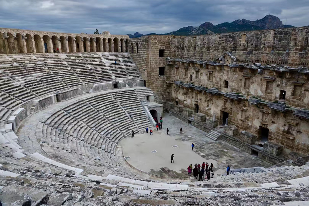 劇場(chǎng)有可容納7000人的扇形石階觀眾席,直徑達(dá)96米,整齊規(guī)則的排列。李仁奇 攝