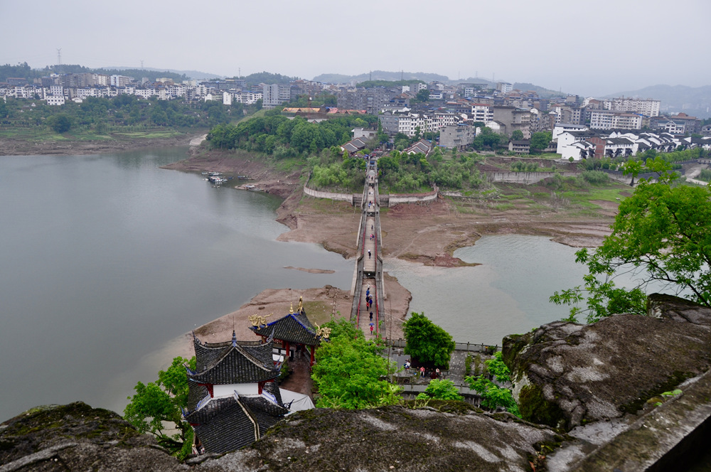 三峽庫區(qū)蓄水后,石寶寨被一道水泥圍堰保護起來,成為孤島,與江岸的聯(lián)系全憑一座吊橋,又被比喻為“世界最大的盆景”、“永不沉沒的航空母艦”。李仁奇 攝