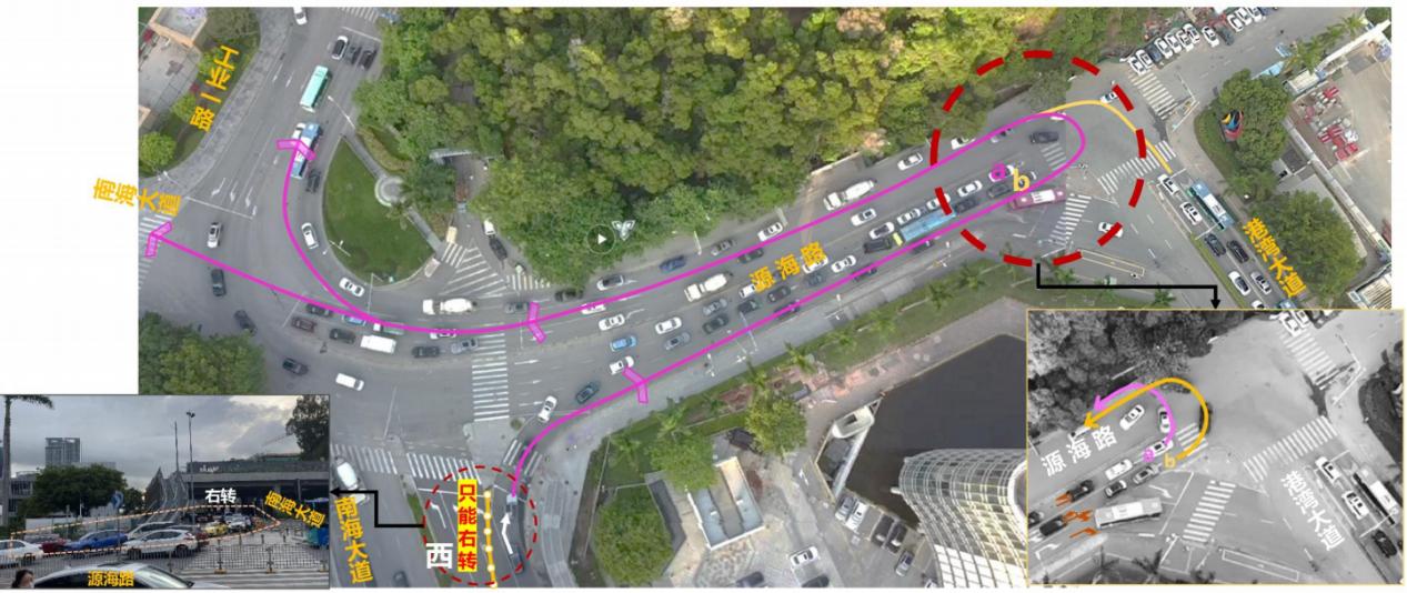 南山區(qū)南海大道時(shí)間廣場(chǎng)路段是通往蛇口、前海的重要道路,早晚高峰期車(chē)流量較大。修地鐵時(shí)在南海大道做了“布袋口臨時(shí)設(shè)施”,南海大道現(xiàn)已經(jīng)恢復(fù)通車(chē),但因臨時(shí)設(shè)施還未及時(shí)拆掉,路口紅綠燈沒(méi)有啟用。加之車(chē)道收窄,原本可以快速左轉(zhuǎn)北行的車(chē)流被擠成一條右轉(zhuǎn)車(chē)道,再擠到老碼頭掉頭,四車(chē)道變一車(chē)道,導(dǎo)致高峰期多數(shù)車(chē)輛爭(zhēng)搶道,既不安全還加劇了擁堵。