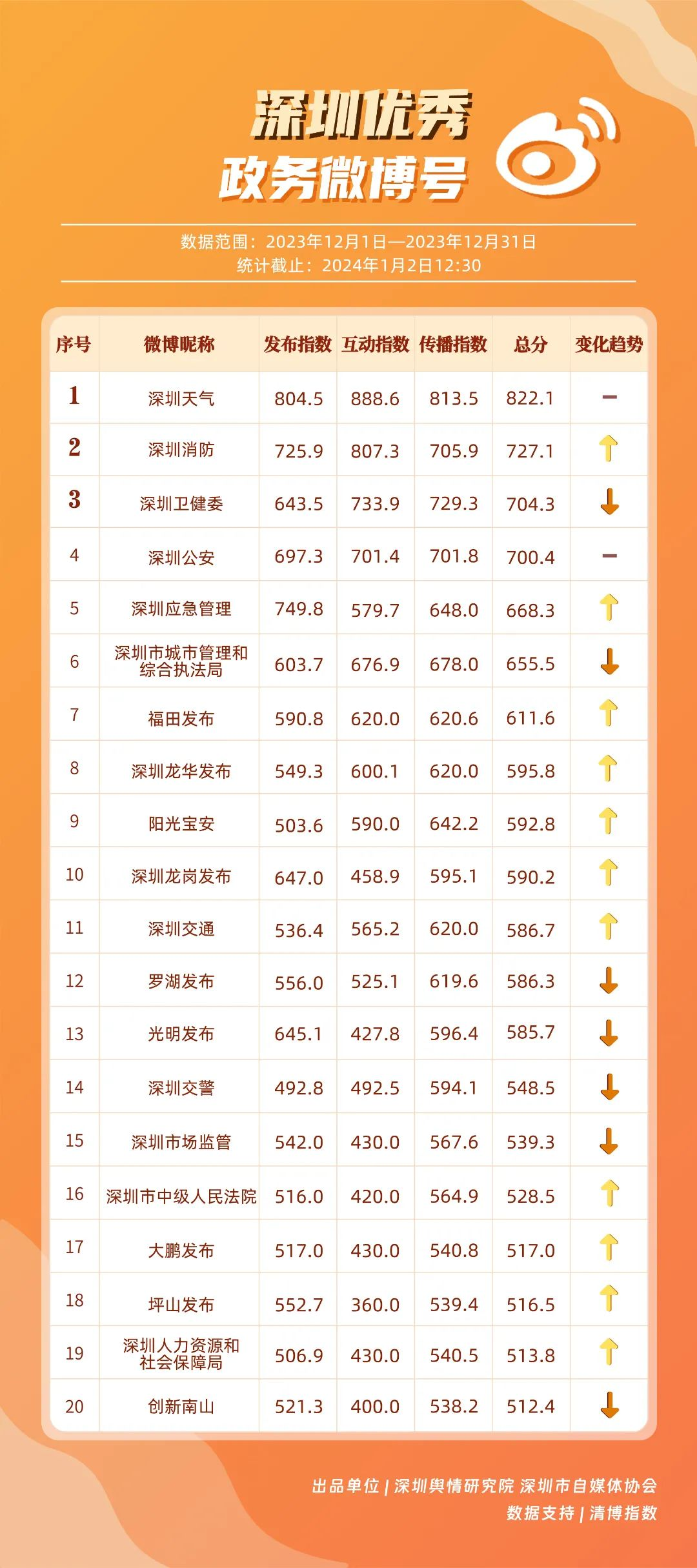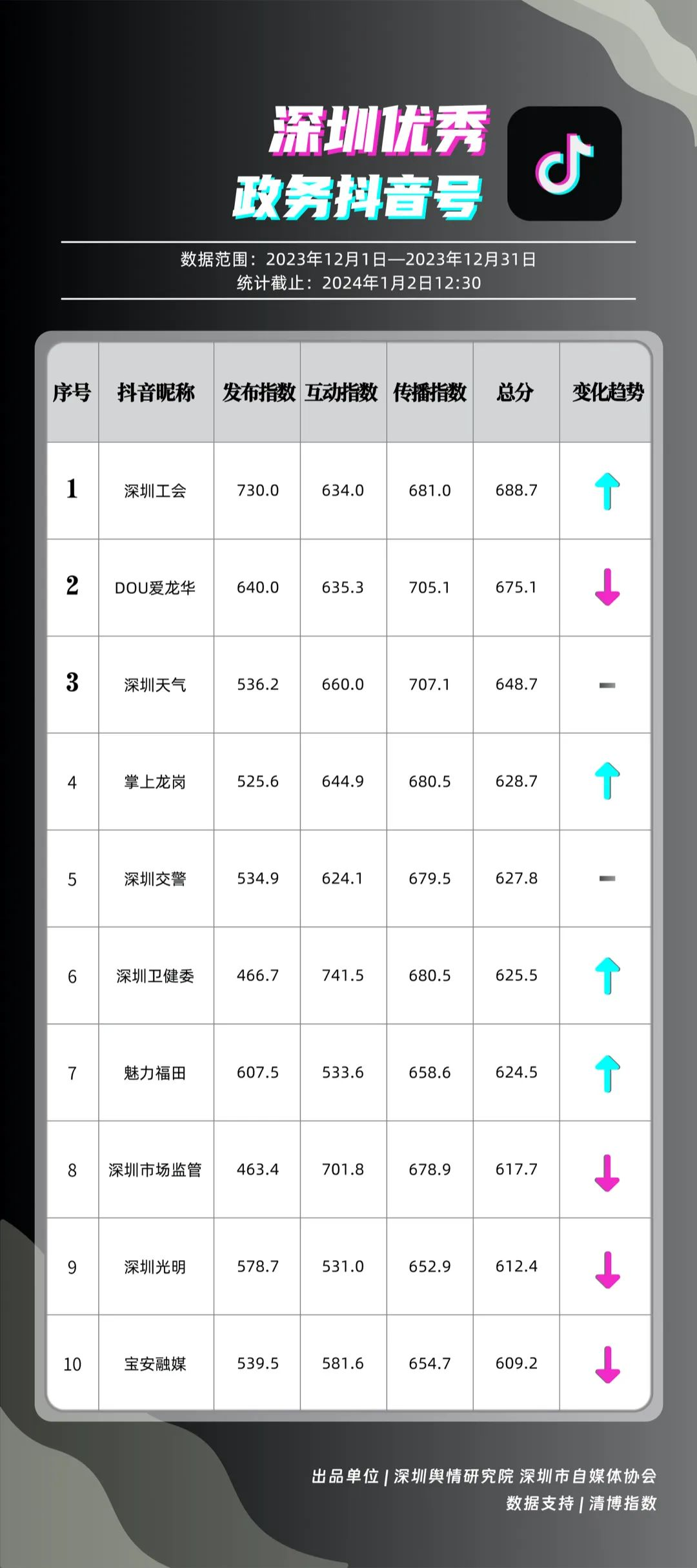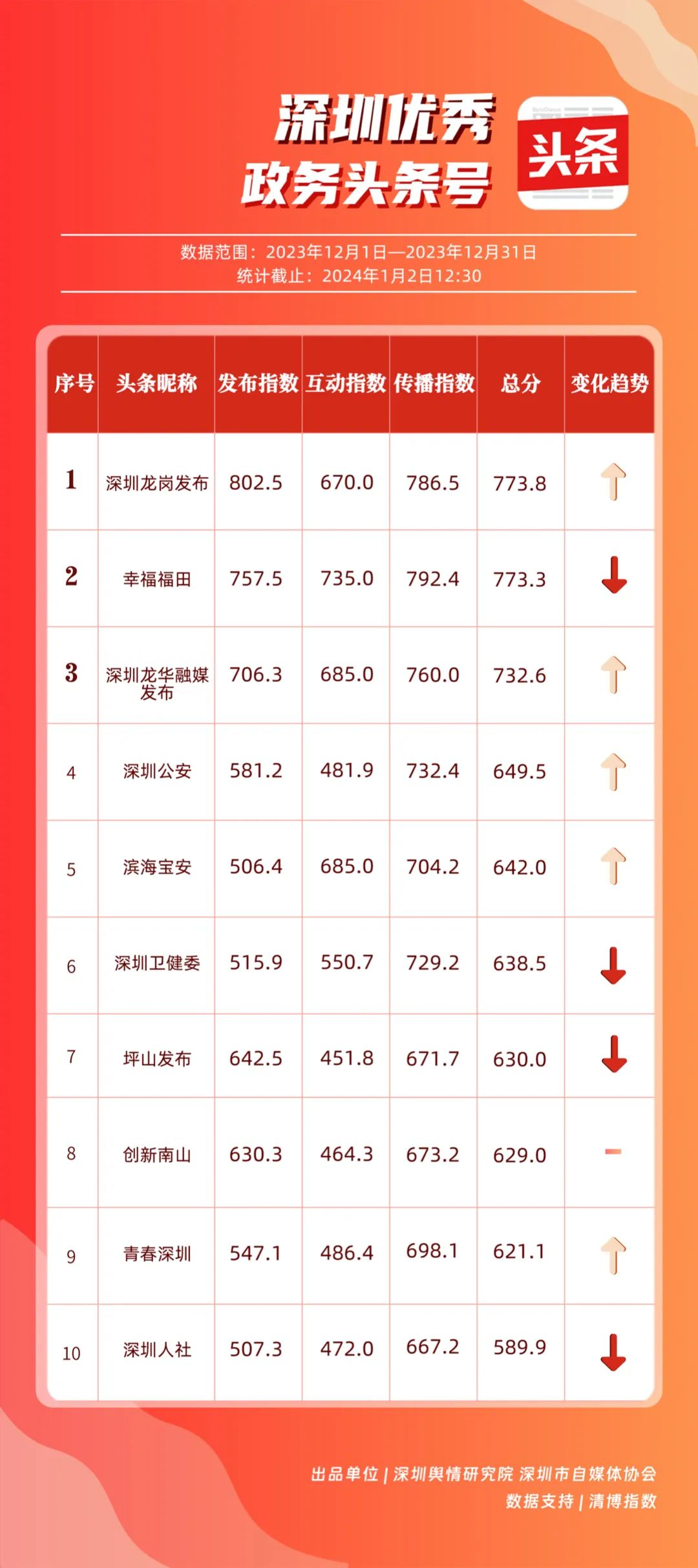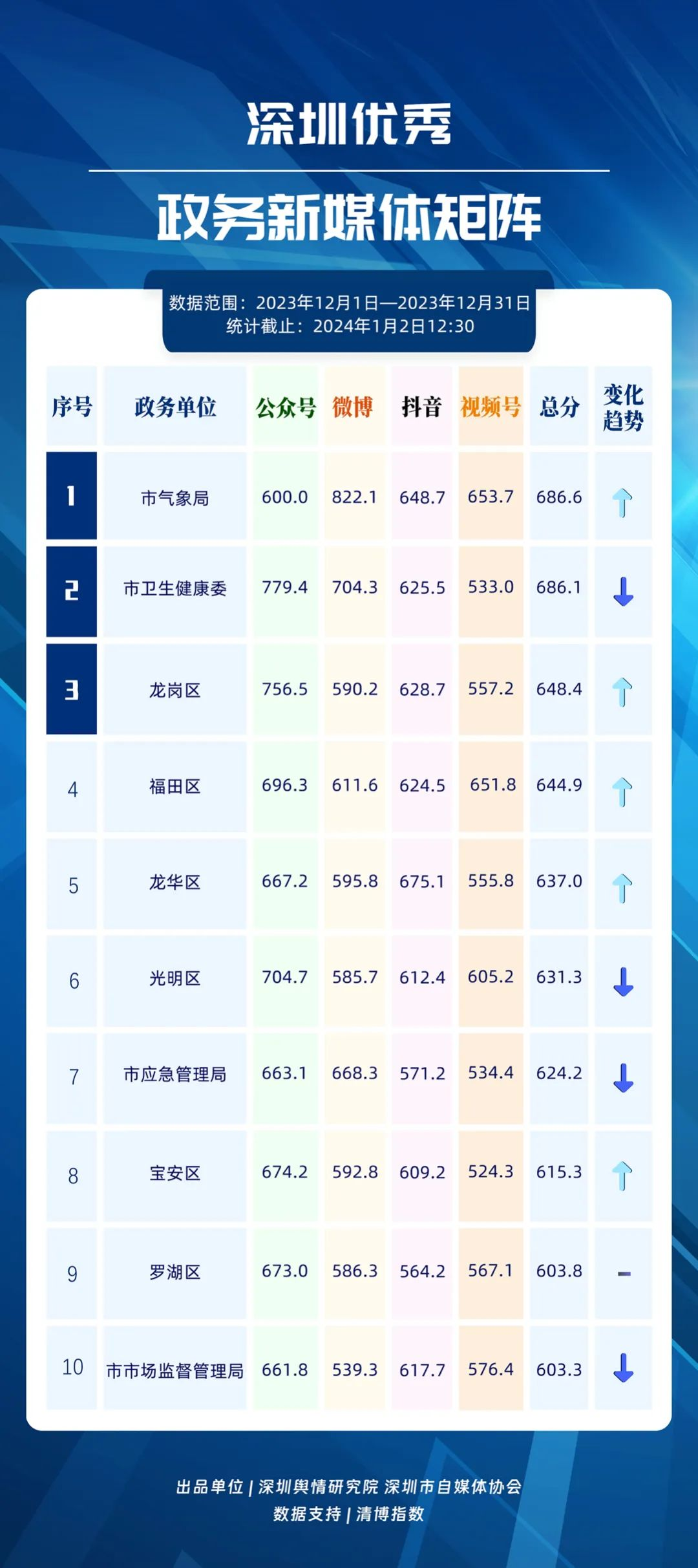 深圳新聞網(wǎng)1月16日訊(記者 陳曉君 實習(xí)生 張馳)2024年1月15日,《深圳優(yōu)秀政務(wù)新媒體矩陣》(2023年12月期)正式發(fā)布,共有10個新媒體矩陣被評為“優(yōu)秀”,分別是市氣象局、市衛(wèi)生健康委、龍崗區(qū)、福田區(qū)、龍華區(qū)、光明區(qū)、市應(yīng)急管理局、寶安區(qū)、羅湖區(qū)、市市場監(jiān)督管理局。上述優(yōu)秀矩陣在內(nèi)容質(zhì)量、更新頻率、粉絲互動等方面穩(wěn)定性較高,獲得公眾的關(guān)注與支持。
