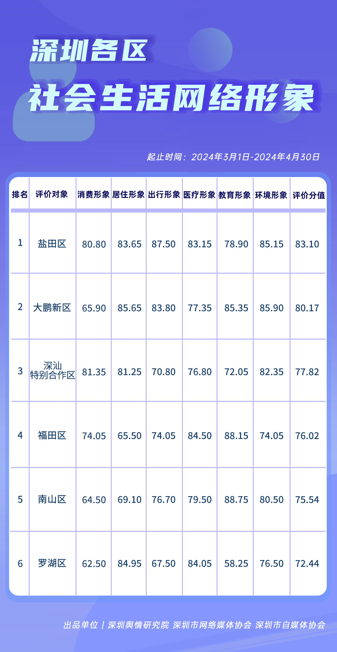 3-4月《深圳各區(qū)社會生活網(wǎng)絡(luò)形象榜》顯示,位居榜單第一名的鹽田區(qū),評價分值為83.10分,且消費、居住、出行、醫(yī)療和環(huán)境形象方面均高于80分,整體社會生活網(wǎng)絡(luò)形象較佳。緊隨其后的大鵬新區(qū)在居住、教育和環(huán)境形象建設(shè)方面,取得的分?jǐn)?shù)都高于85分,表明該區(qū)在打造優(yōu)美宜居生活環(huán)境過程中收獲了較好反饋。位列第三的深汕特別合作區(qū),在消費、居住、環(huán)境形象方面表現(xiàn)也相對較好,得分均在80分以上,助推其社會生活網(wǎng)絡(luò)形象綜合得分走高。福田區(qū)、南山區(qū)、羅湖區(qū)分別占據(jù)了榜單第四,第五和第六的位置,評價分值依次為76.02分、75.54分、72.44分,綜合水平良好,后續(xù)若能充分發(fā)揮優(yōu)勢,著力補齊短板,排名有望持續(xù)提升。