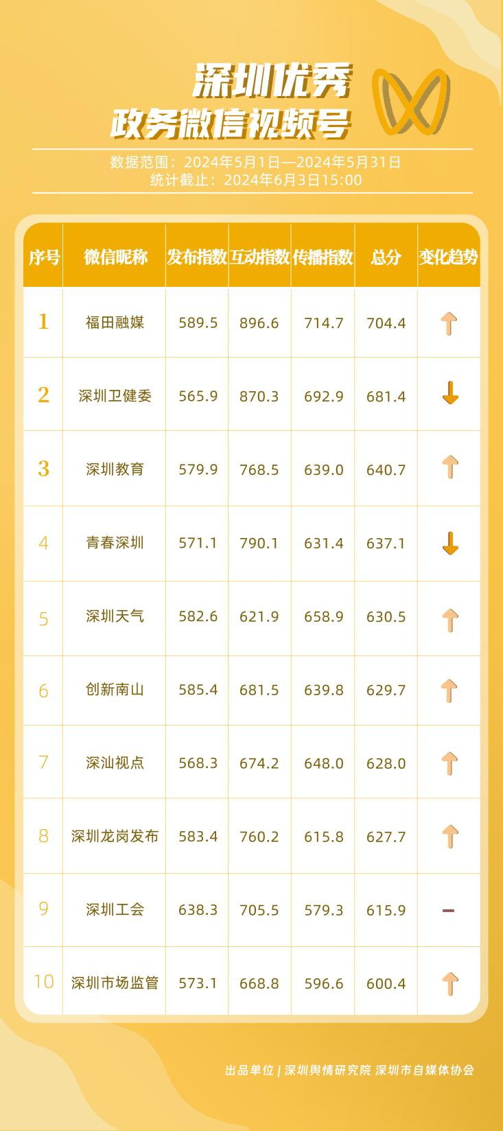 榜單在持續(xù)展示深圳政務新媒體矩陣建設成效的同時,梳理總結了深圳政務微信公眾號、微信視頻號、微博號、抖音號、頭條號的運營方法與經驗,是政務公開、回應群眾關切的重要載體。5月,哪些政務新媒體在本期深受好評,榮登榜單?《深圳優(yōu)秀政務新媒體矩陣》(2024年5月期)邀您共同關注。