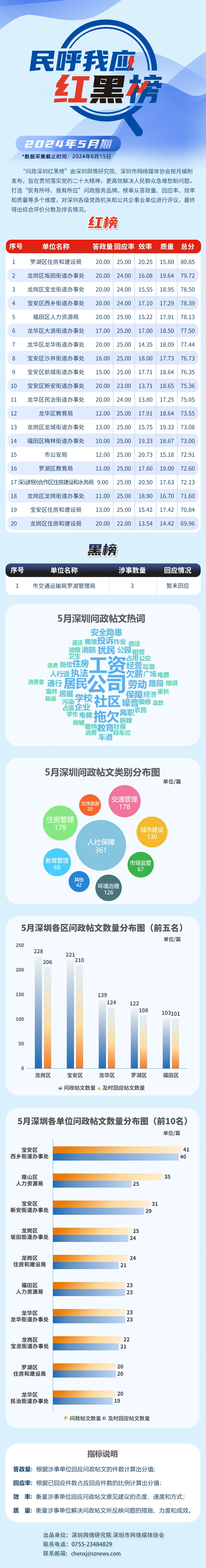 本期榜單采集的帖文主要來自深圳市及各區(qū)政府官網、深圳論壇、人民網領導留言板、深圳新聞網“民呼我應”等平臺,所采集帖文發(fā)布時間為2024年5月1日至5月31日,采集截止時間為2024年6月15日。