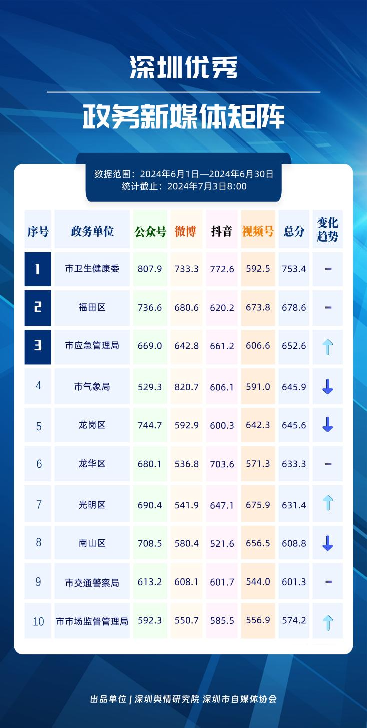 榜單在持續(xù)展示深圳政務(wù)新媒體矩陣建設(shè)成效的同時(shí),梳理總結(jié)了深圳政務(wù)微信公眾號(hào)、微信視頻號(hào)、微博號(hào)、抖音號(hào)、頭條號(hào)的運(yùn)營(yíng)方法與經(jīng)驗(yàn),是政務(wù)公開、回應(yīng)群眾關(guān)切的重要載體。6月,又有哪些政務(wù)新媒體取得優(yōu)異成績(jī)呢?《深圳優(yōu)秀政務(wù)新媒體矩陣》(2024年6月期)邀您共同關(guān)注。