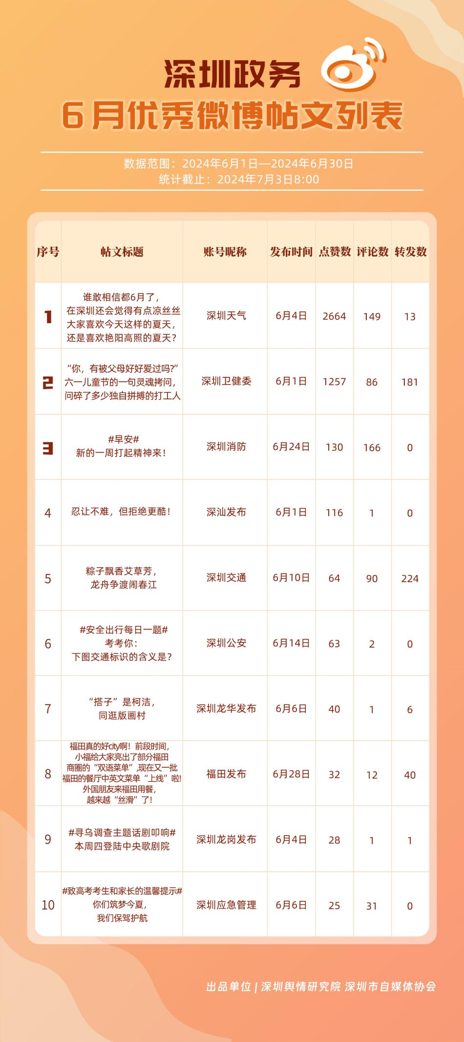 6月,“深圳天氣”“深圳衛(wèi)健委”“深圳消防”“福田發(fā)布”“深圳公安”“深圳應(yīng)急管理”“深圳交通”“深圳市城市管理和綜合執(zhí)法局”“深圳交警”“深圳龍崗發(fā)布”等20個(gè)政務(wù)微博號(hào)入列“優(yōu)秀”名單。“深圳天氣”“深圳衛(wèi)健委”“深圳消防”等賬號(hào)抓住微博平臺(tái)的傳播特征,持續(xù)輸出優(yōu)質(zhì)內(nèi)容,滿足受眾需求,不斷提高用戶體驗(yàn)和傳播效果。