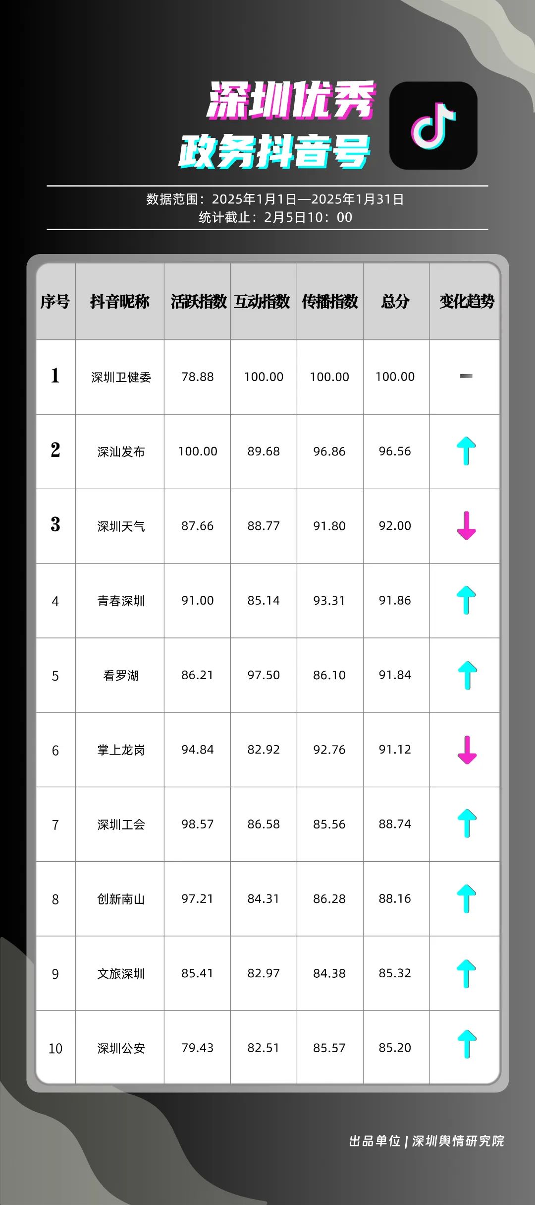 1月,“深圳衛(wèi)健委”“深汕發(fā)布”“深圳天氣”“青春深圳”“看羅湖”“掌上龍崗”“深圳工會(huì)”“創(chuàng)新南山”“文旅深圳”“深圳公安”共10個(gè)政務(wù)抖音號(hào)獲得“深圳優(yōu)秀政務(wù)抖音號(hào)”稱號(hào)?!吧钲谛l(wèi)健委”“深汕發(fā)布”“深圳天氣”成績(jī)優(yōu)異,綜合實(shí)力較強(qiáng),位于榜單前列。“青春深圳”“看羅湖”等賬號(hào)排名有所提升,彰顯了這些賬號(hào)在拓寬受眾基礎(chǔ)、增強(qiáng)用戶黏性等方面所取得的積極成效。