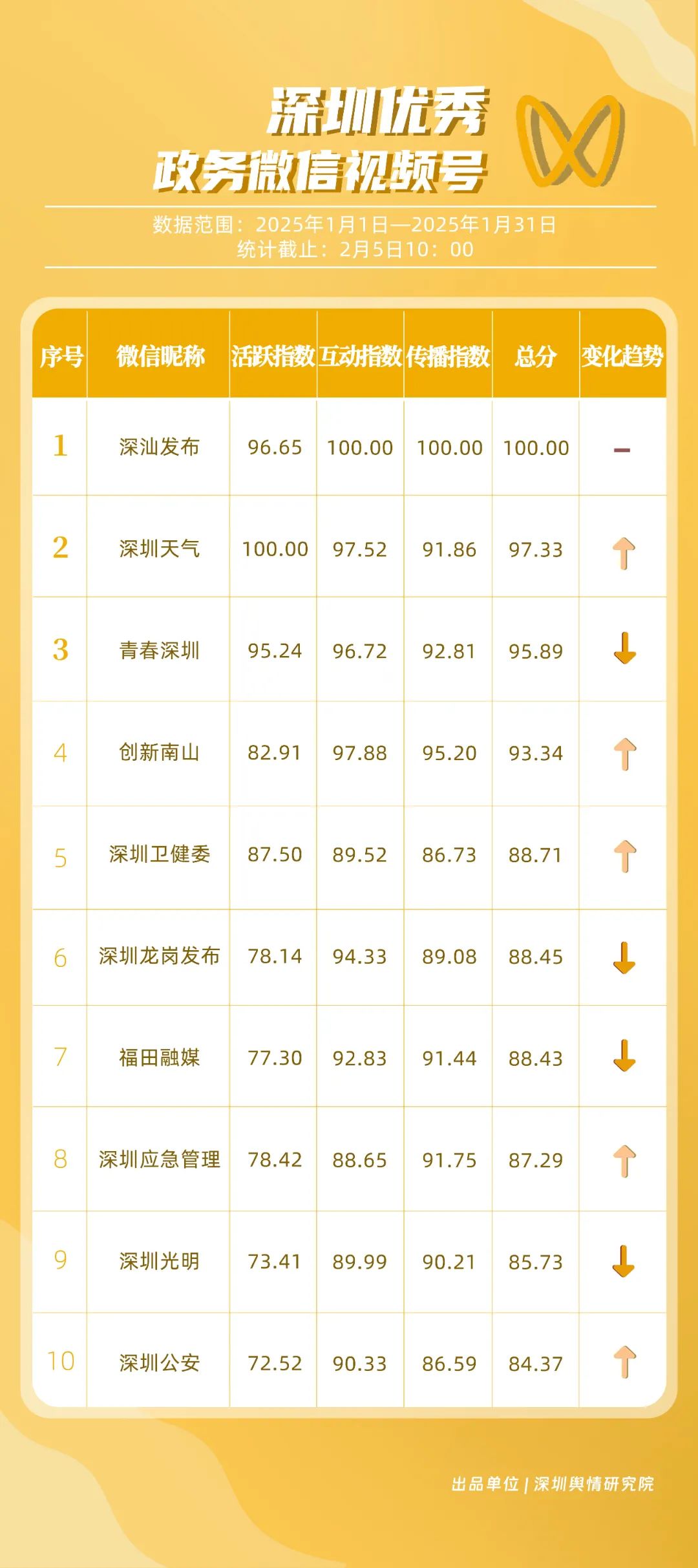 1月,獲“深圳優(yōu)秀政務(wù)微信視頻號(hào)”稱號(hào)的分別是“深汕發(fā)布”“深圳天氣”“青春深圳”“創(chuàng)新南山”“深圳衛(wèi)健委”“深圳龍崗發(fā)布”“福田融媒”“深圳應(yīng)急管理”“深圳光明”“深圳公安”。其中,“深汕發(fā)布”互動(dòng)、傳播數(shù)據(jù)較高,占據(jù)榜單首位。“深圳天氣”“青春深圳”具有較高活躍度,互動(dòng)數(shù)據(jù)良好,總分超95分,位于榜單第二、三名?!皠?chuàng)新南山”“深圳衛(wèi)健委”“深圳應(yīng)急管理”“深圳公安”在排名上有所上升,彰顯了這些賬號(hào)在提升政務(wù)信息傳播效率等方面有所作為。