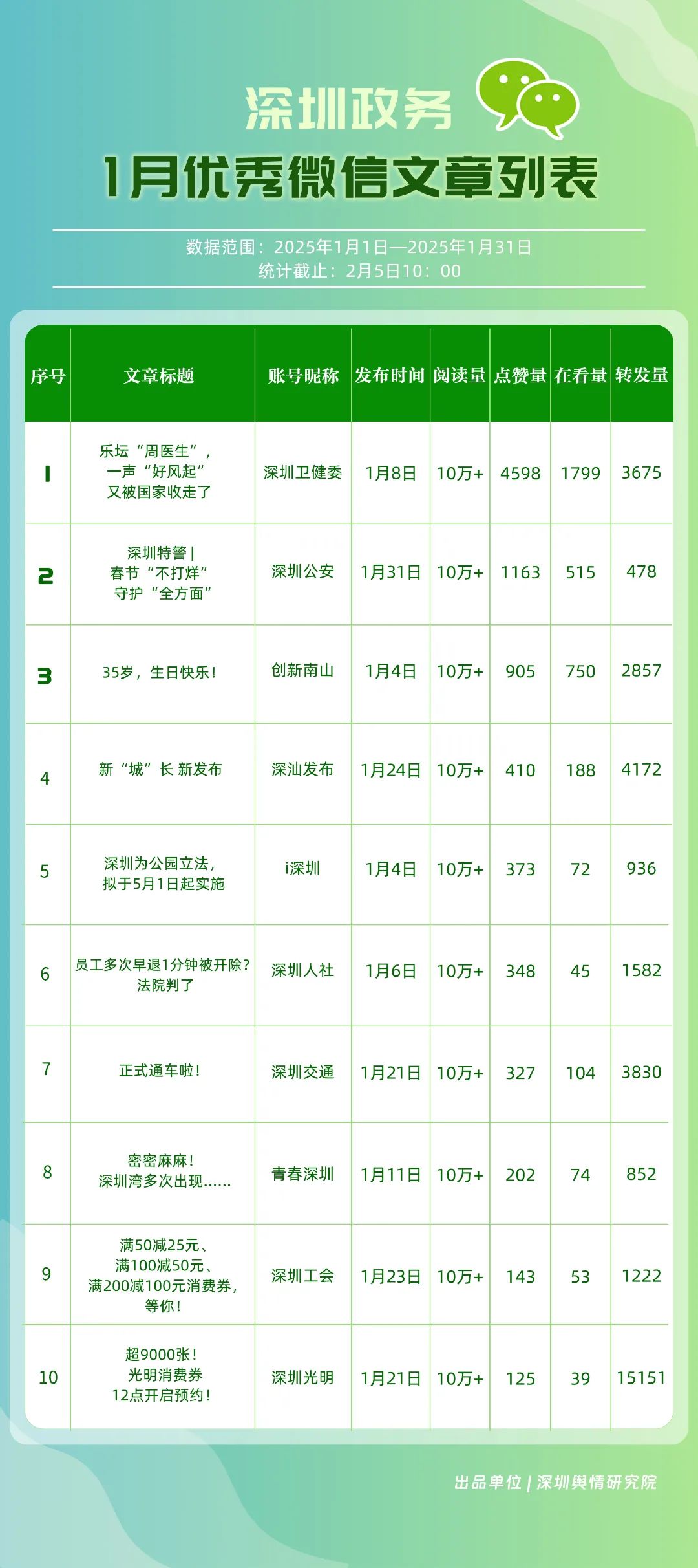 1月,“深圳衛(wèi)健委”“深圳龍崗發(fā)布”“幸福福田”“i深圳”“創(chuàng)新南山”“深圳光明”“青春深圳”“深圳工會(huì)”“羅湖發(fā)布”“濱海寶安”等30個(gè)賬號(hào)入選“深圳優(yōu)秀政務(wù)微信公眾號(hào)”。其中,“深圳衛(wèi)健委”各方面表現(xiàn)卓越,位于榜單首位,獲得總分100分。“深圳龍崗發(fā)布”“青春深圳”“深圳工會(huì)”排名在本期有所提升,反映了這些賬號(hào)在內(nèi)容創(chuàng)新與受眾互動(dòng)方面的不懈努力?!癷深圳”“創(chuàng)新南山”“深圳光明”“羅湖發(fā)布”則保持了穩(wěn)健的排名,持續(xù)在政務(wù)信息的傳播中扮演著不可或缺的角色。
