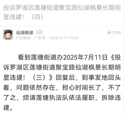 13. 帖文《投訴羅湖區(qū)蓮塘街道聚寶路仙湖楓景長期明顯違建!(四)》