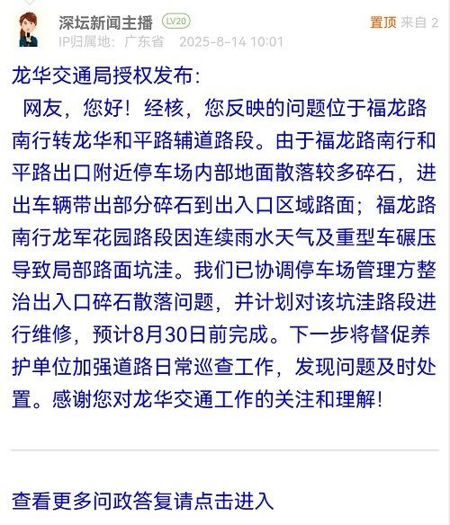 網(wǎng)友,您好!經(jīng)核,您反映的問題位于福龍路南行轉(zhuǎn)龍華和平路輔道路段。由于福龍路南行和平路出口附近停車場內(nèi)部地面散落較多碎石,進(jìn)出車輛帶出部分碎石到出入口區(qū)域路面;福龍路南行龍軍花園路段因連續(xù)雨水天氣及重型車碾壓導(dǎo)致局部路面坑洼。我們已協(xié)調(diào)停車場管理方整治出入口碎石散落問題,并計劃對該坑洼路段進(jìn)行維修,預(yù)計8月30日前完成。下一步將督促養(yǎng)護(hù)單位加強(qiáng)道路日常巡查工作,發(fā)現(xiàn)問題及時處置。感謝您對龍華交通工作的關(guān)注和理解!