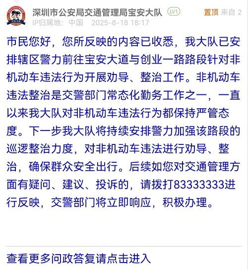 市民您好,您所反映的內(nèi)容已收悉,我大隊(duì)已安排轄區(qū)警力前往寶安大道與創(chuàng)業(yè)一路路段針對非機(jī)動車違法行為開展勸導(dǎo)、整治工作。非機(jī)動車違法整治是交警部門常態(tài)化勤務(wù)工作之一,一直以來我大隊(duì)對非機(jī)動車違法行為都保持嚴(yán)管態(tài)度。下一步我大隊(duì)將持續(xù)安排警力加強(qiáng)該路段的巡邏整治力度,對非機(jī)動車違法進(jìn)行勸導(dǎo)、整治,確保群眾安全出行。后續(xù)如您對交通管理方面有疑問、建議、投訴的,請撥打83333333進(jìn)行反映,交警部門將立即響應(yīng),積極辦理。