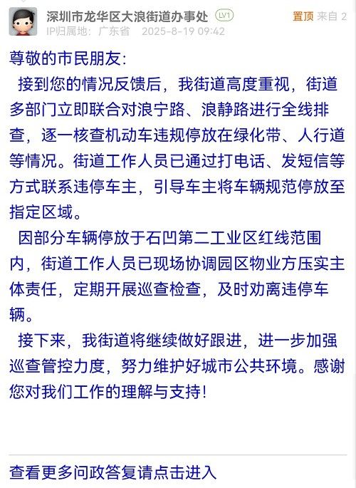 接到您的情況反饋后,我街道高度重視,街道多部門立即聯(lián)合對浪寧路、浪靜路進(jìn)行全線排查,逐一核查機(jī)動車違規(guī)停放在綠化帶、人行道等情況。街道工作人員已通過打電話、發(fā)短信等方式聯(lián)系違停車主,引導(dǎo)車主將車輛規(guī)范停放至指定區(qū)域。