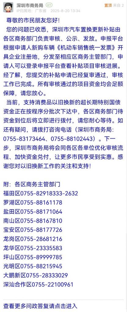 您的問題已收悉,深圳市汽車置換更新補(bǔ)貼由各區(qū)商務(wù)部門負(fù)責(zé)審核、公示、發(fā)放。申報平臺根據(jù)申請人新購車輛《機(jī)動車銷售統(tǒng)一發(fā)票》開具企業(yè)注冊地,分發(fā)至相應(yīng)區(qū)商務(wù)主管部門,申請人可以登錄申報平臺查看補(bǔ)貼項(xiàng)目審核進(jìn)展。經(jīng)了解,您提交的補(bǔ)貼申請已經(jīng)復(fù)審?fù)ㄟ^,審核工作已完成。所有審核通過的項(xiàng)目資金均會足額保障,請您放心。