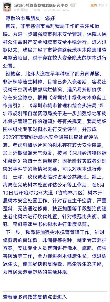 經(jīng)核實(shí),北環(huán)大道在早年種植了部分南洋楹、非洲楝等速生樹種,目前已步入衰老期,容易出現(xiàn)樹干空洞或根部腐爛情況,遇風(fēng)易折斷倒伏,存在安全隱患。根據(jù)《深圳城市綠化樹木修剪工作指引》、《深圳市城市管理和綜合執(zhí)法局 深圳市規(guī)劃和自然資源局關(guān)于進(jìn)一步加強(qiáng)綠地和樹木保護(hù)管理工作的通知》等有關(guān)規(guī)定,我局組織園林綠化專家對樹木進(jìn)行安全評估,并形成2025年市管綠地樹木安全隱患排查處置評估表??紤]到梅林片區(qū)的樹木存在較大安全隱患,加上近期極端天氣頻發(fā),按照《深圳經(jīng)濟(jì)特區(qū)綠化條例》第四十五條規(guī)定:因搶險救災(zāi)或者處理突發(fā)事件等緊急情況需要,可以對樹木進(jìn)行修剪、遷移、砍伐或者臨時占用公共綠地。綜上,我局在完成樹木處置評估公示等工作后,在8月10日后開始對北環(huán)大道(含梅林片區(qū))樹木開展樹木安全處置工作,針對存在主干空腐、嚴(yán)重歪斜,無法通過修剪、扶正加固等手段整治的速生老化樹木進(jìn)行砍伐處置;針對根冠比失衡、偏冠、歪斜等速生老化樹木進(jìn)行重度修剪。