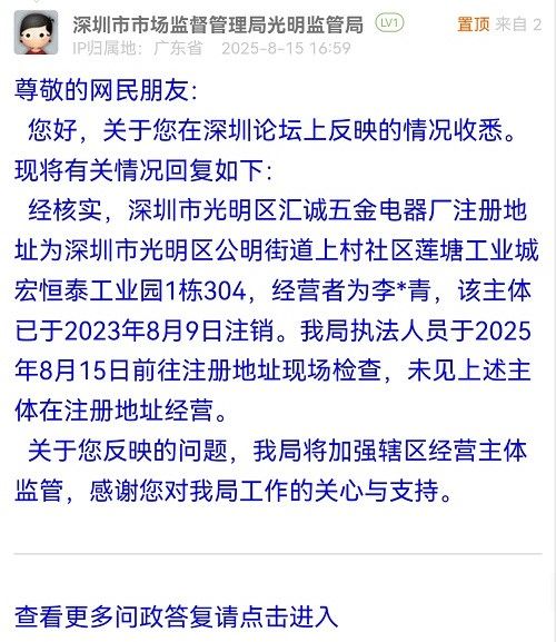 尊敬的網(wǎng)民朋友:您好,關(guān)于您在深圳論壇上反映的情況收悉?,F(xiàn)將有關(guān)情況回復(fù)如下:經(jīng)核實(shí),深圳市光明區(qū)匯誠五金電器廠注冊地址為深圳市光明區(qū)公明街道上村社區(qū)蓮塘工業(yè)城宏恒泰工業(yè)園1棟304,經(jīng)營者為李*青,該主體已于2023年8月9日注銷。我局執(zhí)法人員于2025年8月15日前往注冊地址現(xiàn)場檢查,未見上述主體在注冊地址經(jīng)營。關(guān)于您反映的問題,我局將加強(qiáng)轄區(qū)經(jīng)營主體監(jiān)管,感謝您對我局工作的關(guān)心與支持。