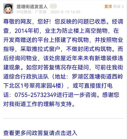 尊敬的網(wǎng)友,您好!您反映的問題已收悉。經(jīng)調(diào)查,2014年初,業(yè)主為防止樓上高空拋物,在開發(fā)商贈送的平臺上搭建了構(gòu)筑物,并按照物業(yè)指導(dǎo),采取推拉式窗戶,不做封閉式構(gòu)筑物。而后經(jīng)詢問物業(yè),該處房屋近年來未有新增裝修違建現(xiàn)象。如您對答復(fù)情況存在疑問,可前往我街道綜合行政執(zhí)法隊(duì)(地址:羅湖區(qū)蓮塘街道西嶺下北區(qū)1號翠苑家園4樓),或可直接撥打電話:0755-25732349進(jìn)行進(jìn)一步咨詢。感謝您對我街道工作的理解與支持。
