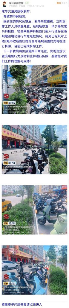 接到您的情況反饋后,我局高度重視,立即安排工作人員核查處置。經(jīng)現(xiàn)場核查,華寧路東龍興科技園、恒昌榮星輝科技園門前人行道存在違規(guī)建設(shè)電動自行車充電樁情況。我局已組織對上述2處市政道路紅線范圍內(nèi)違規(guī)設(shè)置的充電樁進(jìn)行拆除,目前已完成拆除工作。
