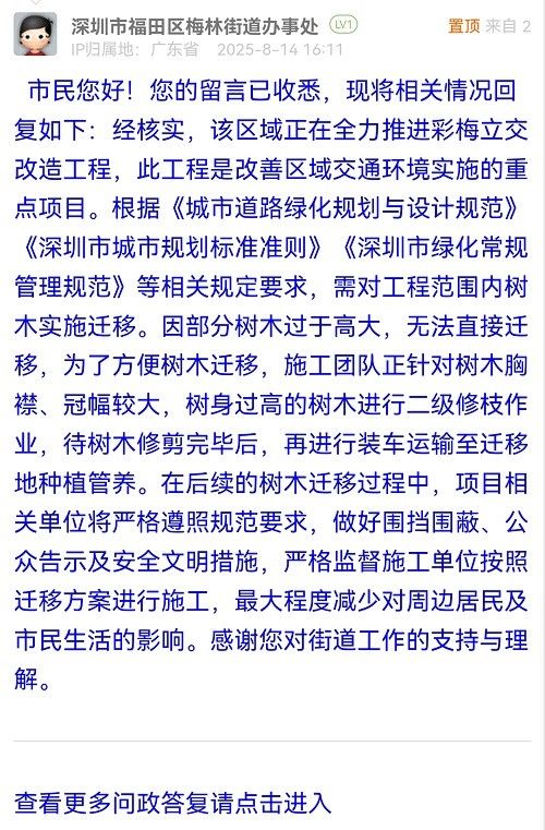 市民您好!您的留言已收悉,現(xiàn)將相關(guān)情況回復(fù)如下:經(jīng)核實(shí),該區(qū)域正在全力推進(jìn)彩梅立交改造工程,此工程是改善區(qū)域交通環(huán)境實(shí)施的重點(diǎn)項(xiàng)目。根據(jù)《城市道路綠化規(guī)劃與設(shè)計規(guī)范》《深圳市城市規(guī)劃標(biāo)準(zhǔn)準(zhǔn)則》《深圳市綠化常規(guī)管理規(guī)范》等相關(guān)規(guī)定要求,需對工程范圍內(nèi)樹木實(shí)施遷移。因部分樹木過于高大,無法直接遷移,為了方便樹木遷移,施工團(tuán)隊(duì)正針對樹木胸襟、冠幅較大,樹身過高的樹木進(jìn)行二級修枝作業(yè),待樹木修剪完畢后,再進(jìn)行裝車運(yùn)輸至遷移地種植管養(yǎng)。在后續(xù)的樹木遷移過程中,項(xiàng)目相關(guān)單位將嚴(yán)格遵照規(guī)范要求,做好圍擋圍蔽、公眾告示及安全文明措施,嚴(yán)格監(jiān)督施工單位按照遷移方案進(jìn)行施工,最大程度減少對周邊居民及市民生活的影響。感謝您對街道工作的支持與理解。
