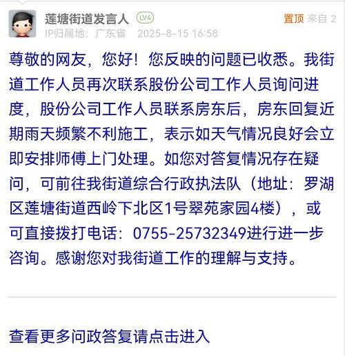 尊敬的網(wǎng)友,您好!您反映的問題已收悉。我街道工作人員再次聯(lián)系股份公司工作人員詢問進(jìn)度,股份公司工作人員聯(lián)系房東后,房東回復(fù)近期雨天頻繁不利施工,表示如天氣情況良好會立即安排師傅上門處理。如您對答復(fù)情況存在疑問,可前往我街道綜合行政執(zhí)法隊(duì)(地址:羅湖區(qū)蓮塘街道西嶺下北區(qū)1號翠苑家園4樓),或可直接撥打電話:0755-25732349進(jìn)行進(jìn)一步咨詢。感謝您對我街道工作的理解與支持。
