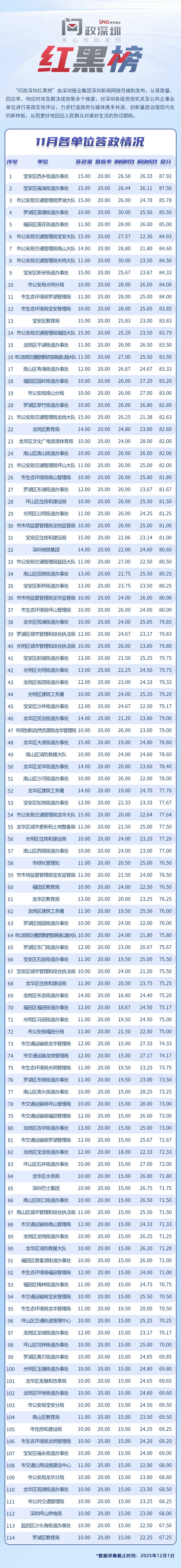 為探尋媒體如何精準賦能基層治理現(xiàn)代化的“深圳路徑”,深圳報業(yè)集團正式掛牌成立“問政深圳”工作室,旨在進一步推動網(wǎng)絡問政工作的高效開展。為確保相關(guān)工作更加契合實際需求,深圳報業(yè)集團深圳新聞網(wǎng)按照“最快速度辦結(jié)”的總體要求,將原有月度榜單創(chuàng)新升級為“問政深圳紅黑榜”,并對評分體系進行了細致優(yōu)化。該榜單從答政量、回應率、響應時效及解決成效等多個維度,對深圳各級黨政機關(guān)及公共企事業(yè)單位進行答政實效評議,力求打造政府與媒體攜手共進、創(chuàng)新基層治理現(xiàn)代化的新樣板,從而更好地回應人民群眾對美好生活的熱切期盼。