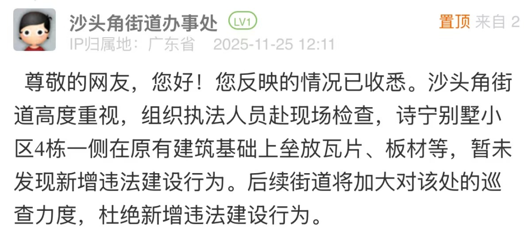 優(yōu)化建議:針對網(wǎng)民投訴的小區(qū)違建問題,街道回應僅以“未發(fā)現(xiàn)新增違法建設行為”簡單回復,尚有完善空間。若該點位存在建設年代久遠、權(quán)屬界定模糊、涉及多主體協(xié)調(diào)等客觀難點,可適度說明,并在回應中補充核查細節(jié),說明后續(xù)處置方向與階段計劃,讓回應更具可信度和實操性,回應市民對“依法履職”的期待。