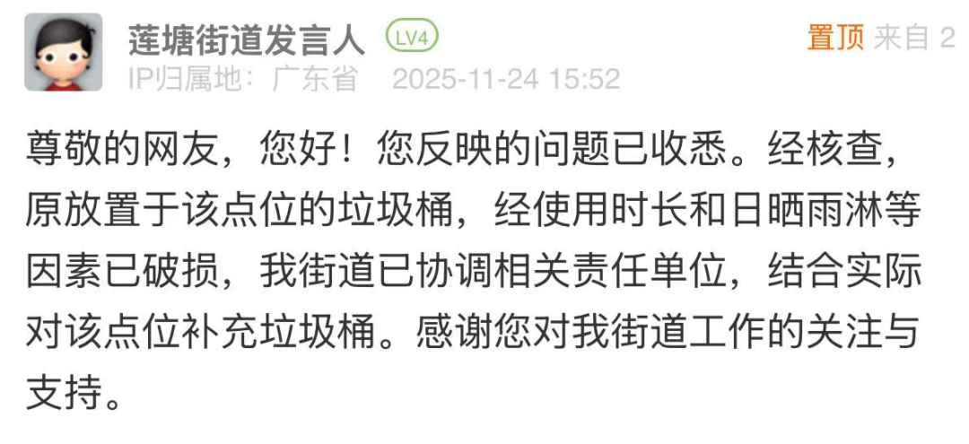 案例點評:針對市民反映“垃圾桶無故取消”的問題,街道辦在3小時內(nèi)完成核查,清晰說明垃圾桶搬離原因,同時迅速協(xié)調(diào)相關(guān)責任單位,結(jié)合實際情況明確將為該點位補充垃圾桶,切實解決群眾投放垃圾的剛需。此次處置迅速有效,既體現(xiàn)了直面民生訴求、不推諉不拖延的工作態(tài)度,也展現(xiàn)了精細化治理能力,為后續(xù)環(huán)衛(wèi)設施維護和民生需求響應提供了范本。