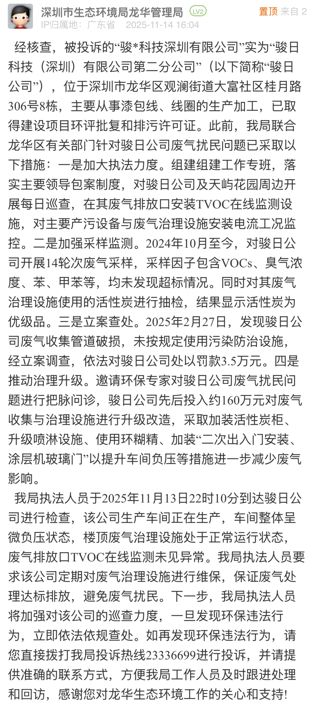 優(yōu)化建議:針對市民反映的工業(yè)廢氣擾民問題,相關(guān)部門雖采取巡查監(jiān)測、立案查處、推動設備升級等舉措,但未能實質(zhì)性化解居民困擾。在該問政網(wǎng)帖的評論區(qū),有多位業(yè)主留言反映,近一年來“天天聞到臭氣”,并對“采樣均未發(fā)現(xiàn)超標情況”的回復表示質(zhì)疑。建議相關(guān)部門在依托專業(yè)設備檢測的同時,結(jié)合居民“嗅辨”反饋開展精準溯源,切實回應群眾對清新環(huán)境的基本訴求,推動治理從“數(shù)據(jù)達標”轉(zhuǎn)向“群眾滿意”。