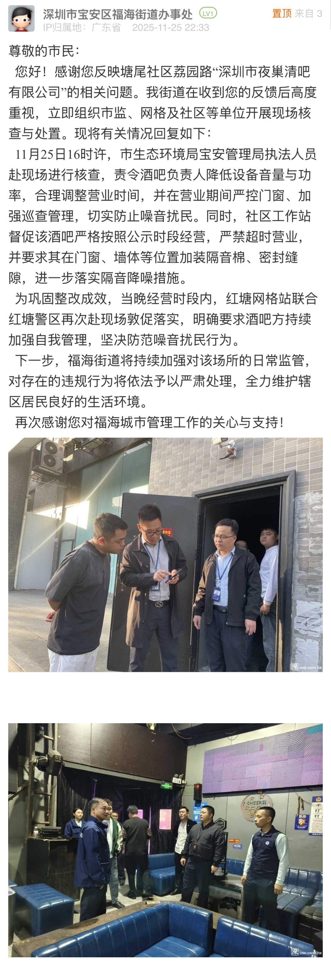 2、有市民反映寶安區(qū)福海街道一酒吧噪音擾民