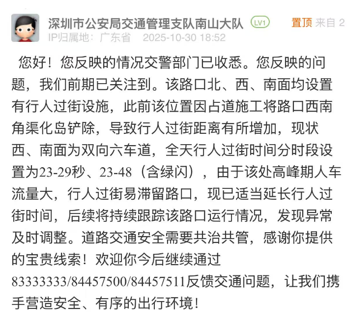 案例點評:南山交管部門在24小時內對市民所反饋的問題進行答復,展現(xiàn)出精準、高效的治理態(tài)度,既說明過街時間短的原因,又根據(jù)該路口在高峰期人流大的實際情況,適當延長過街時間,體現(xiàn)出“因需調整、務實便民”的理念?;貞校摬块T還強調后續(xù)將持續(xù)跟蹤路口通行情況、及時優(yōu)化調整等,展示了精細化治理的決心和理念。